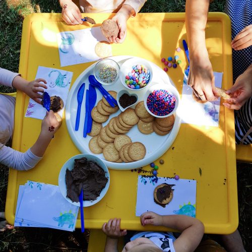 In the same vein, make the rest of the food yourself as well. Remember, people aren’t there for breakfast or lunch, just for a few snacks. Besides the cake, we had some “allergy friendly” cupcakes (these aren’t a must, I just made them so that all of our friends could enjoy the food), sliced watermelon, simple sugar biscuits with blobs of different colour icing, cheese puffs (so addictive), cheese and lettuce sandwiches and some white chocolate eggs. For drinks we had water with lemon in and then some fruit juice. So simple, so easy and all really affordable!